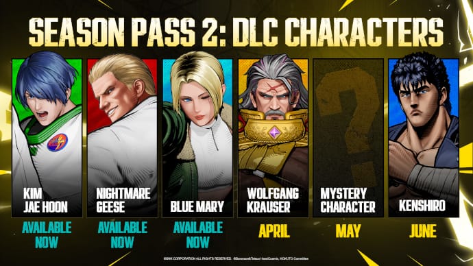 Season Pass 2 will feature six characters, with one character scheduled for release every month. The lineup includes Kim Jae Hoon, Nightmare Geese, Blue Mary, and Wolfgang Krauser from the Fatal Fury series, plus Kenshiro from the anime FIST OF THE NORTH STAR—with another mystery character to be announced at a later date.